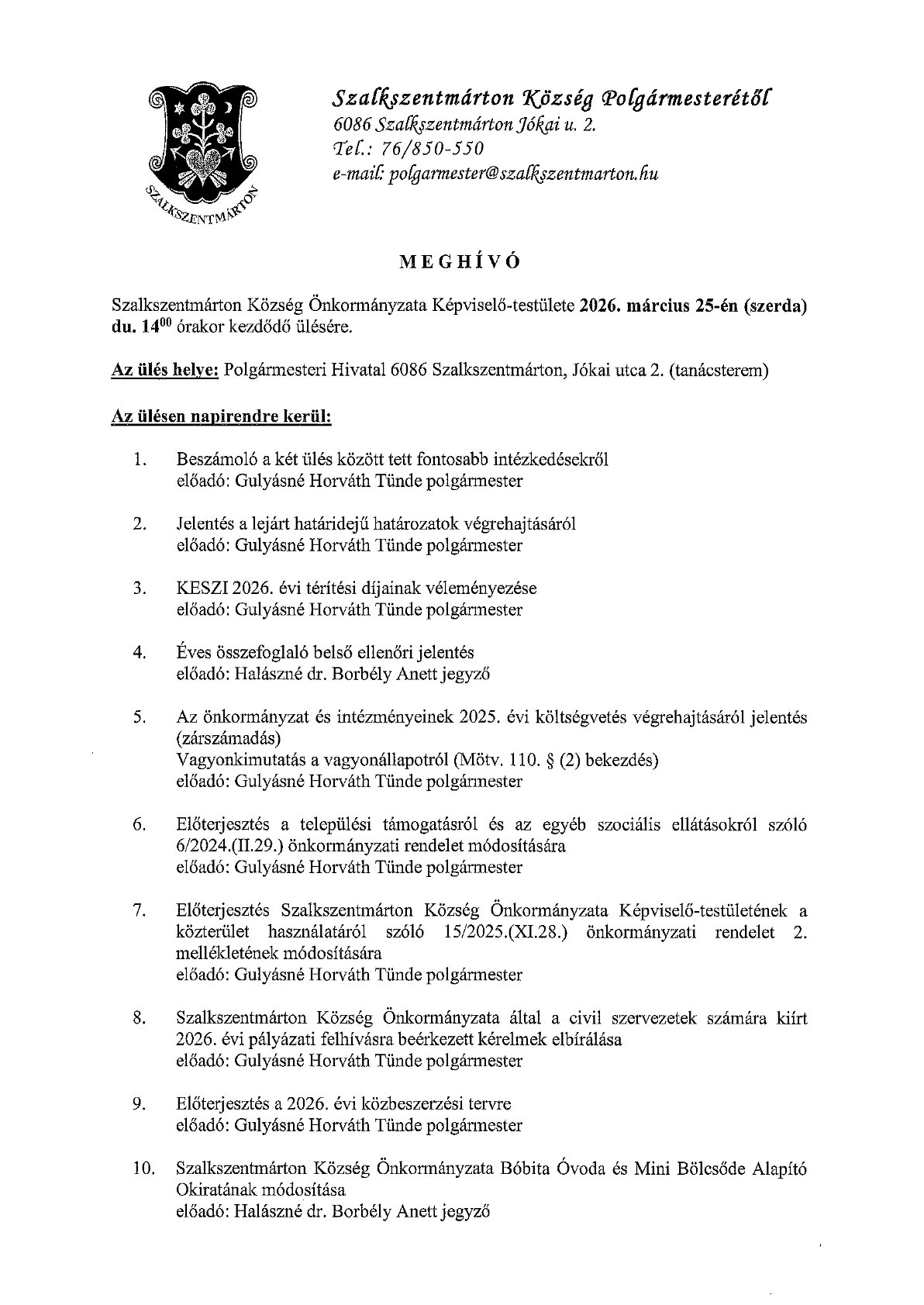 Meghívó Képviselő-testületi ülésre - 2026. március 25.